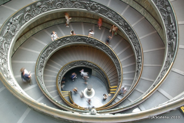 Stairwell from the Vatican Museum (Musei Vaticani). The Italian (Spirale Giú) name means “downward spiral”.